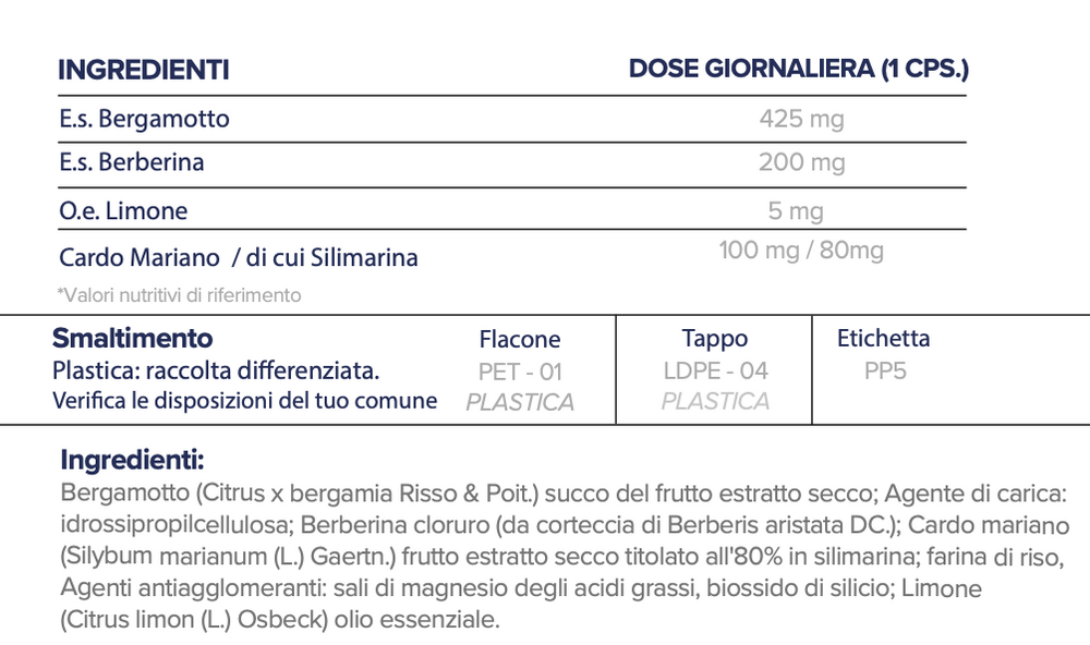 Avvertenze Non superare la dose giornaliera consigliata. Sconsigliato in gravidanza, allattamento e in caso di terapia con farmaci ipolipidemizzanti. Non utilizzare in caso di allergia nota ai componenti.